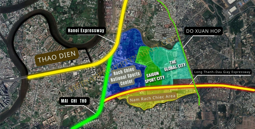 Located along Do Xuan Hop Avenue and the Long Thanh – Dau Giay Expressway, and situated within the overall master plan of the Rach Chiec National Sports Complex.