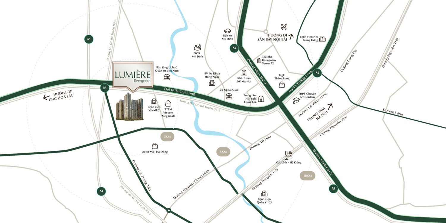 Furthermore, Lumiere Evergreen is adjacent to 3 urban rail transit lines (Metro) No. 5, 6, and 7, enabling residents to easily connect with the city center and surrounding areas like Ha Dong, Dong Anh, Lang Hoa Lac, and central areas through Hanoi's most modern public transportation. This opens tremendous potential for property value appreciation at Lumiere Smart City.