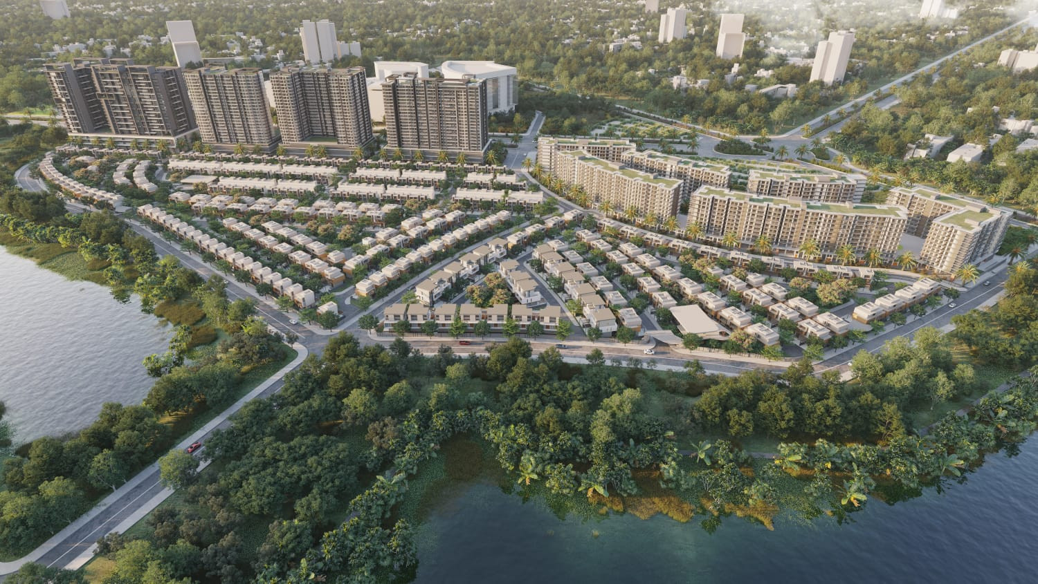 - The project offers a green living environment with panoramic views over the central lake and a large central park. Its low building density ensures a quiet, private atmosphere close to nature.