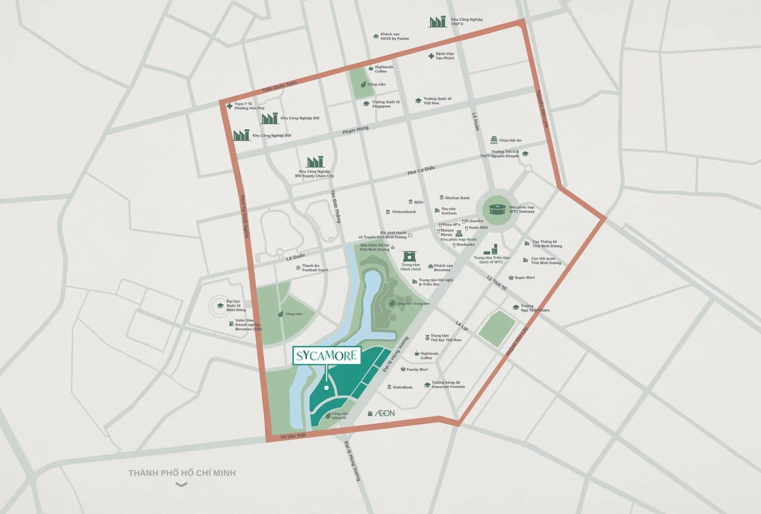 Sycamore is located on the prestigious Hung Vuong Boulevard, the main artery of the new city of Thu Dau Mot, Binh Duong province. This prime spot allows residents to easily access key regional destinations:
